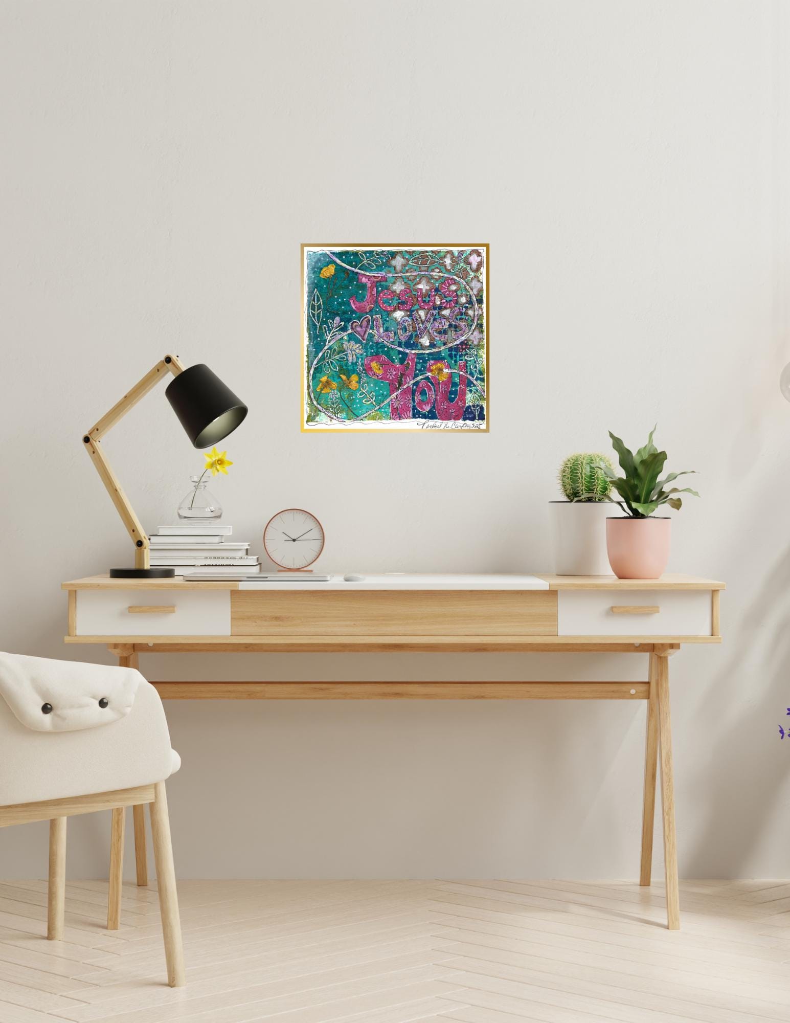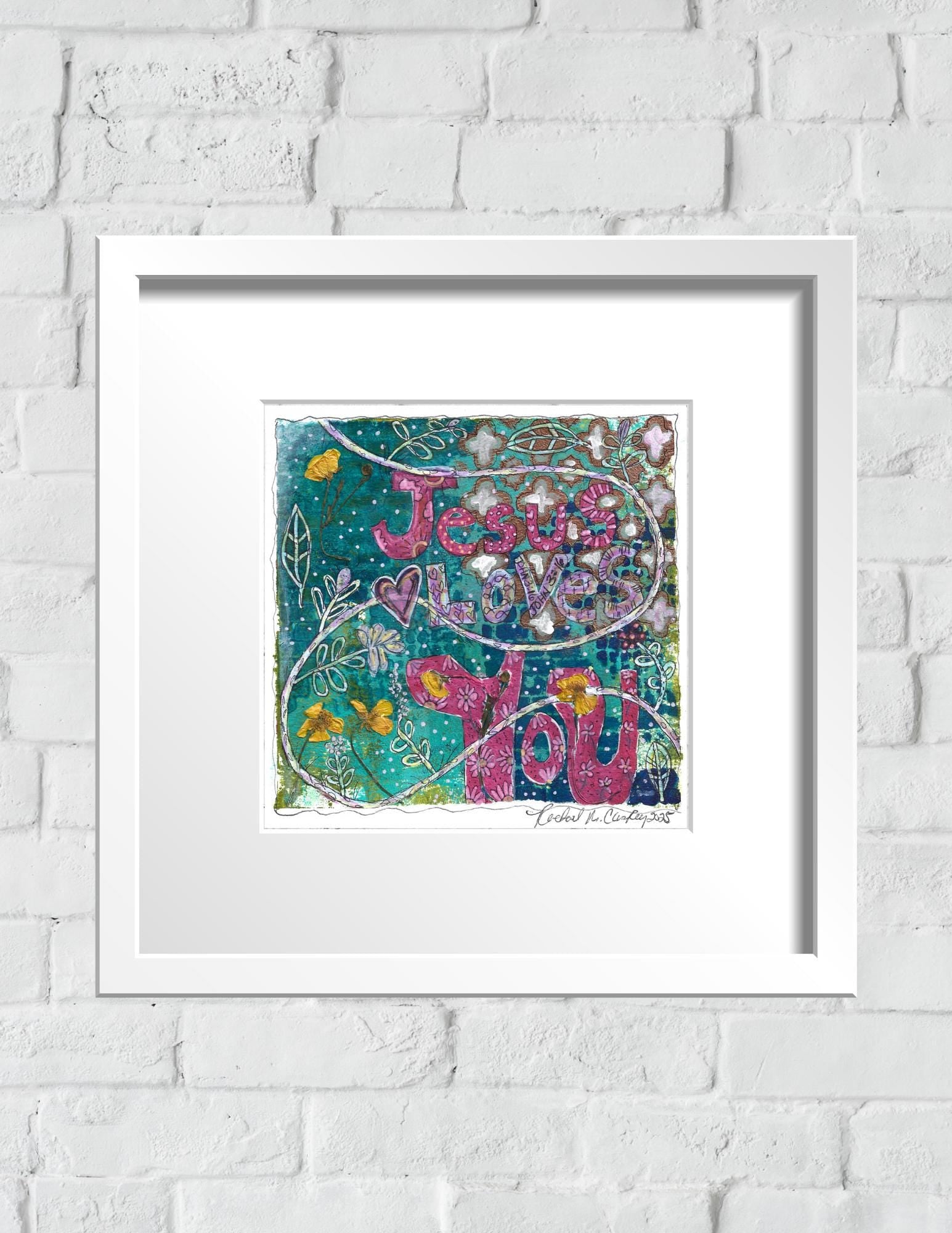 Brighten your space with this joyful “Jesus Loves You” digital art printable, created from my original mixed media artwork featuring real hand-pressed buttercup flowers! This unique piece blends vibrant layers of paint, playful florals, scripture, and hand-drawn details to offer a daily reminder of God's love and grace.